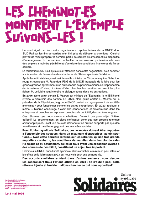 Comme à la SNCF, dans l’unité syndicale, allons arracher le maximum pour atténuer les effets de la loi retraites 2023 qui nous vole deux ans de notre vie.