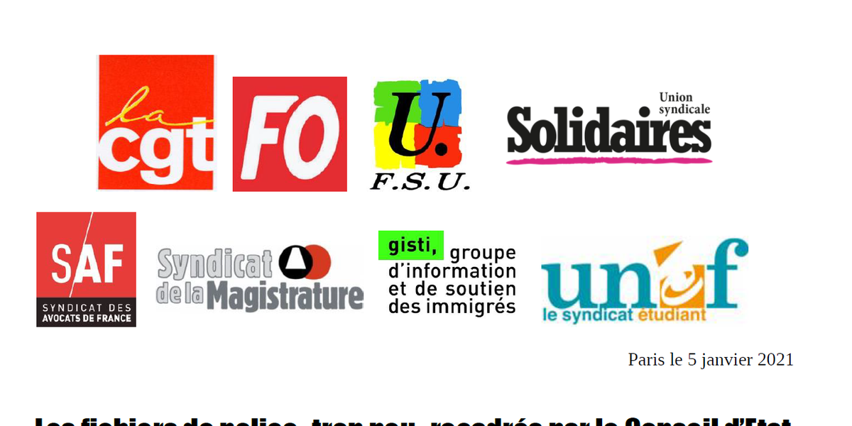 Communiqué commun CGT FO FSU SAF SM GISTI Solidaires UNEF suite au rejet par le Conseil d'Etat du référé suspension introduit par nos organisations contre les 3 décrets relatifs au fichage des activités militantes. Le Conseil d'Etat a tout de même encadré mais bien trop peu les données pouvant donner lieu à fichage policier.... tout cela dans l'attente d'un examen au fond des décrets où nous espérons cette fois obtenir la censure de ces décrets honteux !