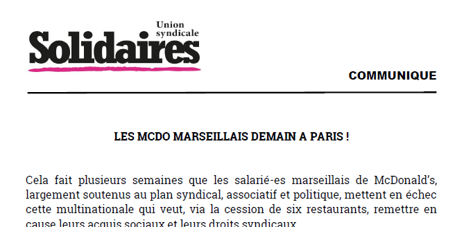 Cela fait plusieurs semaines que les salarié-es marseillais de McDonald’s, largement soutenus au plan syndical, associatif et politique, mettent en échec cette multinationale qui veut, via la cession de six restaurants, remettre en cause leurs acquis sociaux et leurs droits syndicaux.