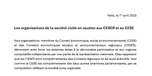 Nos organisations, membres du Conseil économique, social et environnemental (CESE) et des Conseils économiques sociaux et environnementaux régionaux (CESER), dénoncent avec force les atteintes faites à la démocratie participative et aux organes consultatifs indépendants par une partie de la représentation nationale. Elles rappellent que les CESER sont complémentaires des Conseils régionaux et de leurs exécutifs, tout comme le CESE est complémentaire des deux autres chambres parlementaires, par sa composition reflétant la société civile organisée.