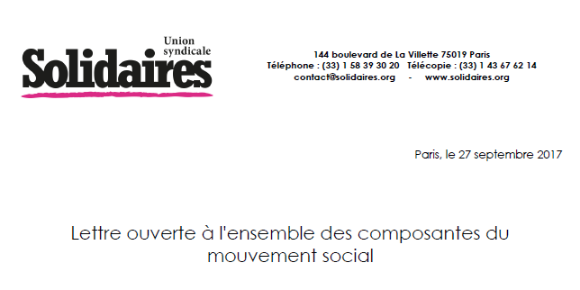 Aussi, l’Union syndicale Solidaires vous propose de nous rencontrer et de débattre de nos analyses de la situation et des nécessaires formes de mobilisation, de leur coordination pour les jours et semaines à venir, le 4 octobre à 18 h à la bourse du travail.