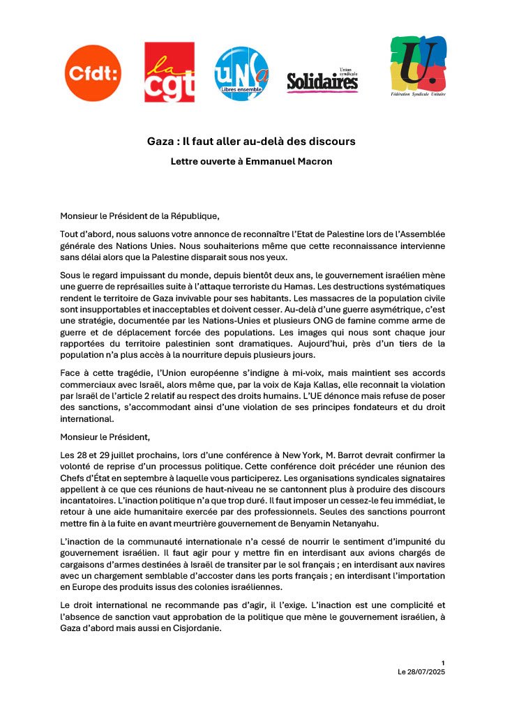Les 28 et 29 juillet prochains, lors d’une conférence à New York, M. Barrot devrait confirmer la volonté de reprise d’un processus politique. Cette conférence doit précéder une réunion des Chefs d’État en septembre à laquelle vous participerez. Les organisations syndicales signataires appellent à ce que ces réunions de haut-niveau ne se cantonnent plus à produire des discours incantatoires. L’inaction politique n’a que trop duré. Il faut imposer un cessez-le feu immédiat, le retour à une aide humanitaire exercée par des professionnels. Seules des sanctions pourront mettre fin à la fuite en avant meurtrière gouvernement de Benyamin Netanyahu.