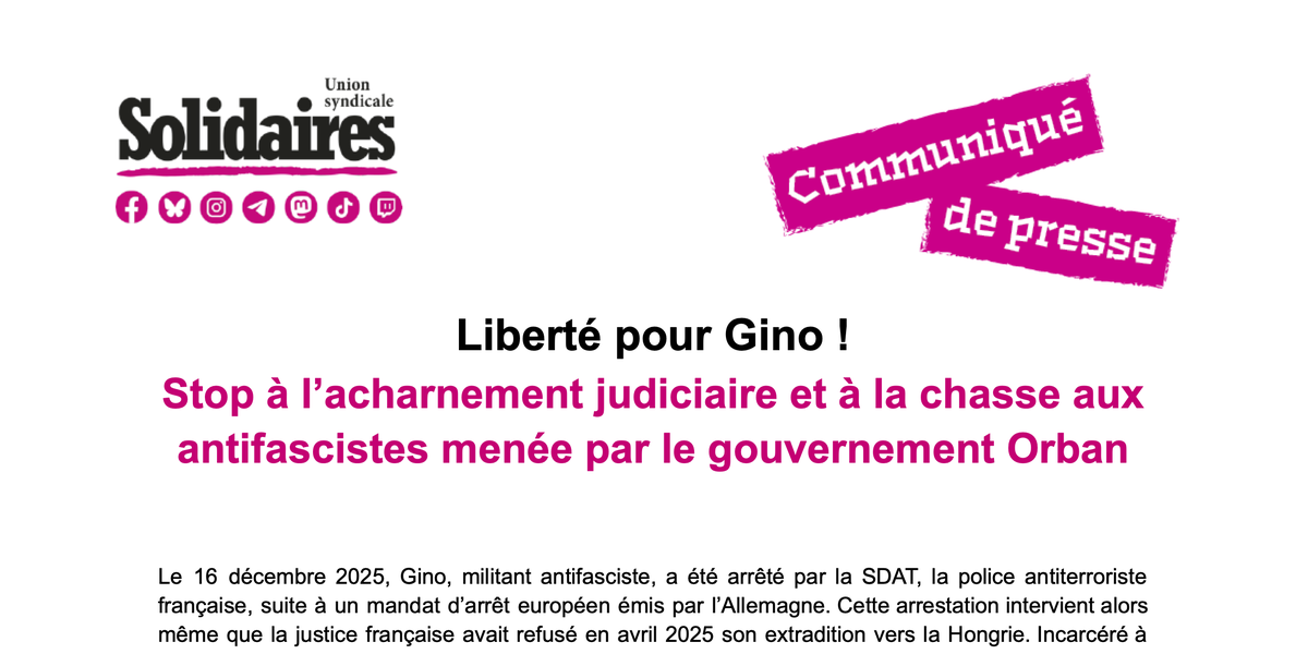 Le 16 décembre 2025, Gino, militant antifasciste, a été arrêté par la SDAT, la police antiterroriste française, suite à un mandat d’arrêt européen émis par l’Allemagne. Cette arrestation intervient alors même que la justice française avait refusé en avril 2025 son extradition vers la Hongrie. Incarcéré à Fresnes, Gino a été remis en liberté peu avant Noël. Le 28 janvier, la justice française décidera du sort du mandat d’arrêt européen émis par l’Allemagne.