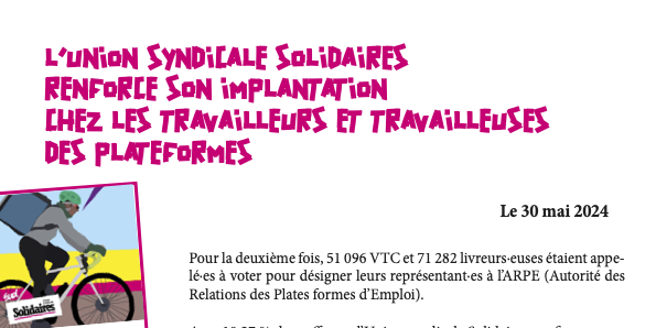 Avec 10,27 % des suffrages l’Union syndicale Solidaires confirme sa représentativité chez les livreurs et livreuses avec une nette progression (+ 4,58 points).