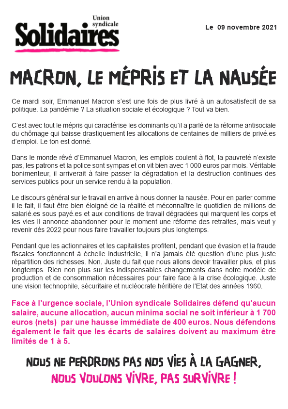 Le discours général sur le travail en arrive à nous donner la nausée. Pour en parler comme il le fait, il faut être bien éloigné de la réalité et méconnaître le quotidien de millions de salarié.es sous payé.es et aux conditions de travail dégradées qui marquent les corps et les vies Il annonce abandonner pour le moment une réforme des retraites, mais veut y revenir dès 2022 pour nous faire travailler toujours plus longtemps.