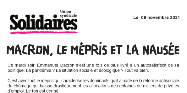 C’est avec tout le mépris qui caractérise les dominants qu’il a parlé de la réforme antisociale du chômage qui baisse drastiquement les allocations de centaines de milliers de privé.es d’emploi. Le ton est donné.
