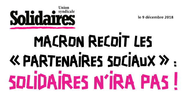 A 19h30 dimanche soir, l’Union syndicale Solidaires a reçu une invitation du Président de la République nous conviant « à une réunion avec les forces politiques, territoriales, économiques et sociales en présence du Premier Ministre et des membres du Gouvernement », annoncée à grands renforts de publicité, demain matin, lundi 10 décembre.