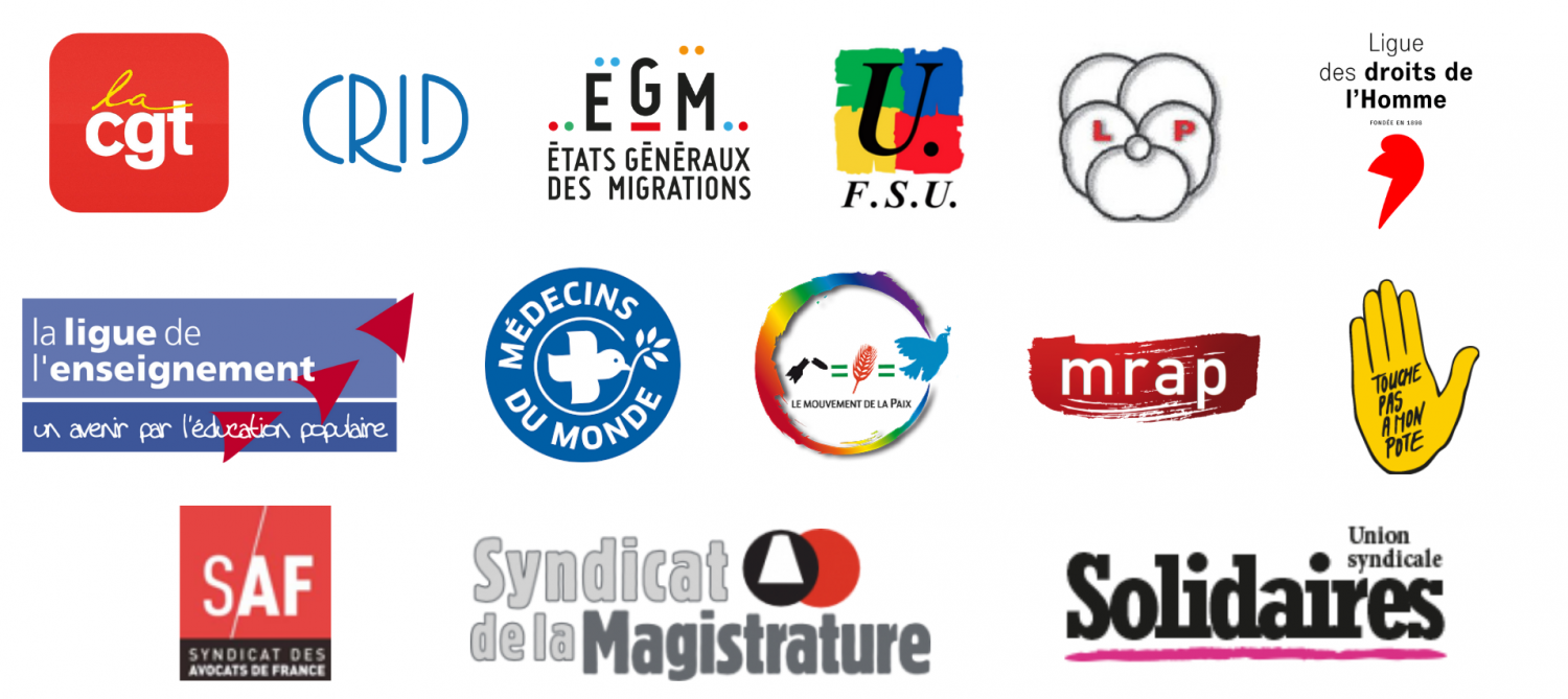 Signataires : CGT - CRID - États Généraux des Migrations - FSU - Libre Pensée - Ligue des droits de l’Homme - Ligue de l’Enseignement - Médecins du Monde - Mouvement de la Paix – MRAP - SOS Racisme - Syndicat des Avocats de France - Syndicat de la Magistrature - Union Syndicale Solidaires