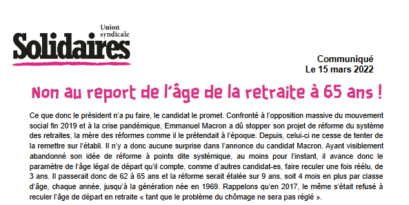 L’Union syndicale Solidaires s’opposera à toute réforme de ce type et toutes les réformes néolibérales qui appauvrissent et pillent les richesses des travailleur-euses au profit d’une caste de plus en plus riche.