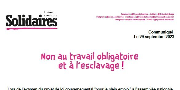 Lors de l’examen du projet de loi gouvernemental “pour le plein emploi” à l’assemblée nationale, la droite a réussi à faire passer une de ses marottes : obliger les allocataires du RSA à travailler au moins 15h par semaine pour bénéficier de leur allocation, tout cela au bénéfice du patronat qui n’aura pas un centime à verser. En réalité ce travail forcé n’a qu’un seul objectif : radier en masse les bénéficiaires du RSA et jeter dans la misère la plus noire les classes populaires !