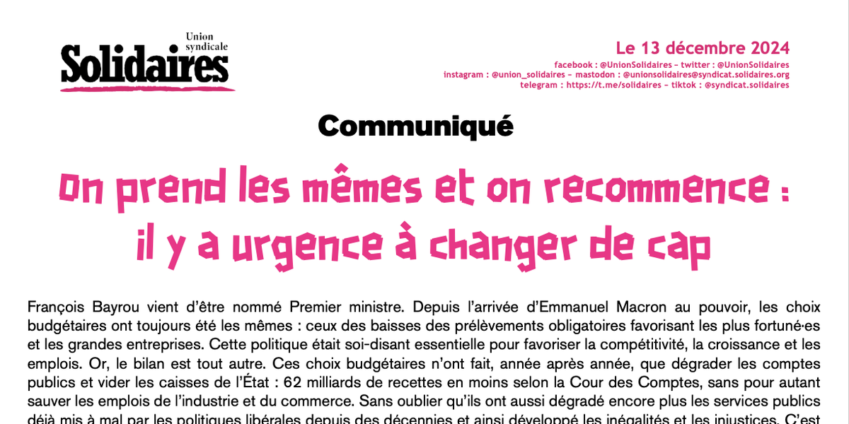 François Bayrou vient d’être nommé Premier ministre. Depuis l’arrivée d’Emmanuel Macron au pouvoir, les choix budgétaires ont toujours été les mêmes : ceux des baisses des prélèvements obligatoires favorisant les plus fortuné∙es et les grandes entreprises. Cette politique était soi-disant essentielle pour favoriser la compétitivité, la croissance et les emplois. Or, le bilan est tout autre. Ces choix budgétaires n’ont fait, année après année, que dégrader les comptes publics et vider les caisses de l’État : 62 milliards de recettes en moins selon la Cour des Comptes, sans pour autant sauver les emplois de l’industrie et du commerce. Sans oublier qu’ils ont aussi dégradé encore plus les services publics déjà mis à mal par les politiques libérales depuis des décennies et ainsi développé les inégalités et les injustices. C’est pourquoi nous sommes particulièrement inquiet·es de voir se poursuivre cette politique, massivement rejetée dans la population et dont les effets sont délétères, creusent les inégalités et renforcent le vote d’extrême droite.