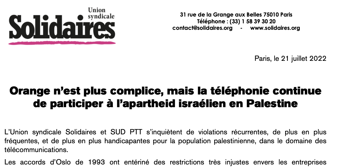 L’Union syndicale Solidaires et SUD PTT s’inquiètent de violations récurrentes, de plus en plus fréquentes, et de plus en plus handicapantes pour la population palestinienne, dans le domaine des télécommunications.