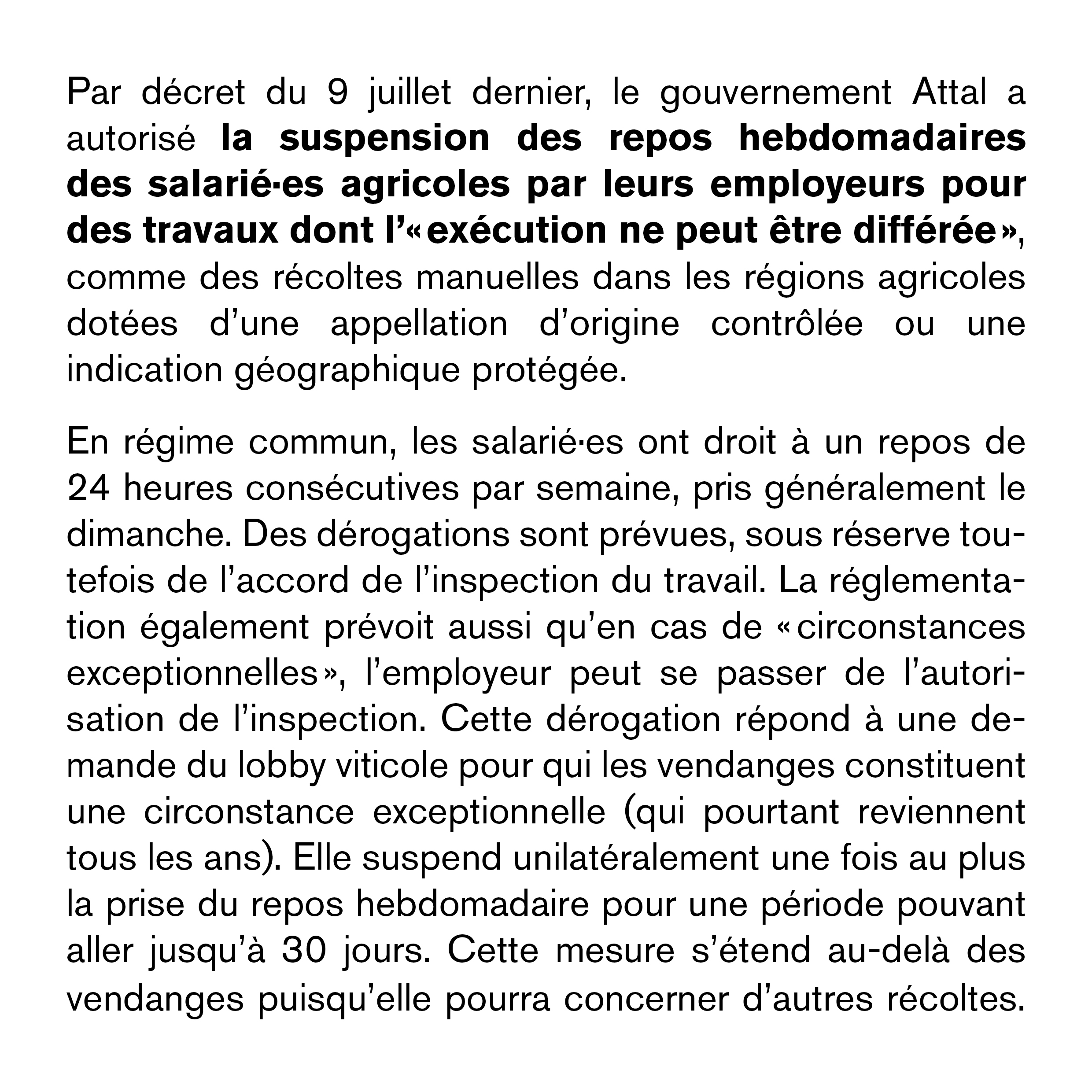 Par décret du 9 juillet dernier, le gouvernement Attal a autorisé la suspension des repos hebdomadaires des salarié·es agricoles par leurs employeurs pour des travaux dont l’« exécution ne peut être différée », comme des récoltes manuelles dans les régions agricoles dotées d’une appellation d'origine contrôlée ou une indication géographique protégée.