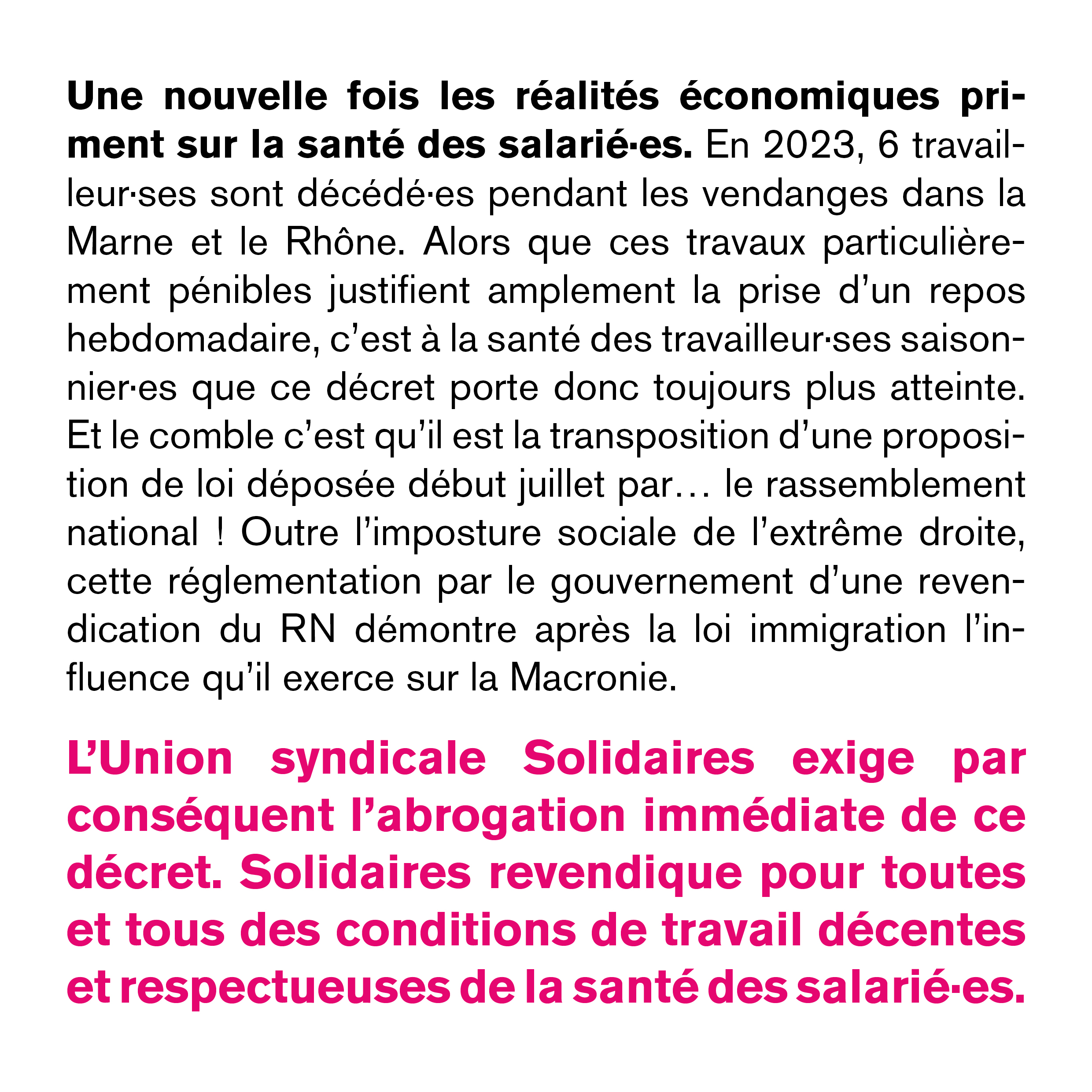 Une nouvelle fois les réalités économiques priment sur la santé des salarié·es. En 2023, 6 travailleur·ses sont décédé·es pendant les vendanges dans la Marne et le Rhône. Alors que ces travaux particulièrement pénibles justifient amplement la prise d’un repos hebdomadaire, c’est à la santé des travailleur·ses saisonnier·es que ce décret porte donc toujours plus atteinte. Et le comble c’est qu’il est la transposition d’une proposition de loi déposée début juillet par … le rassemblement national ! Outre l’imposture sociale de l’extrême droite, cette réglementation par le gouvernement d’une revendication du RN démontre après la loi immigration l’influence qu’il exerce sur la Macronie.