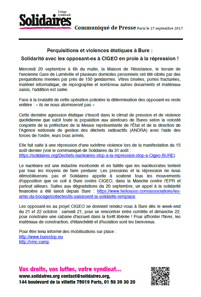 Perquisitions et violences étatiques à Bure : Solidarité avec les opposant-es à CIGEO en proie à la répression !
