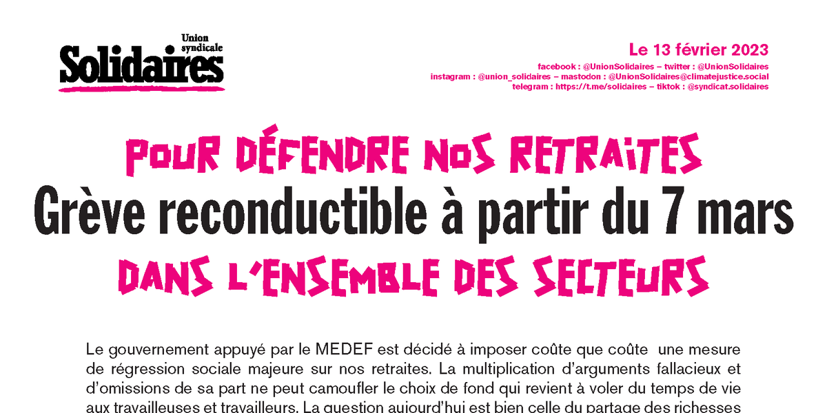 Toutes et tous ensemble, nous avons la possibilité de mettre un coup d’arrêt à l’action anti-sociale de ce gouvernement sur les retraites. Notre victoire sur cette bataille ouvrira tous les possibles sur les retraites bien sûr, mais aussi sur les salaires, le chômage ou les minimas sociaux, sur le logement et l’immigration, et plus largement d’améliorations sociales et écologiques.