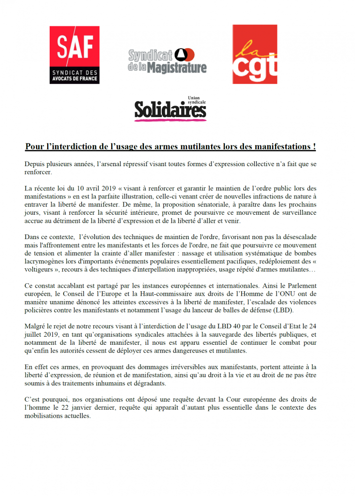 Malgré le rejet de notre recours visant à l’interdiction de l’usage du LBD 40 par le Conseil d’Etat le 24 juillet 2019, en tant qu’organisations syndicales attachées à la sauvegarde des libertés publiques, et notamment de la liberté de manifester, il nous est apparu essentiel de continuer le combat pour qu’enfin les autorités cessent de déployer ces armes dangereuses et mutilantes.