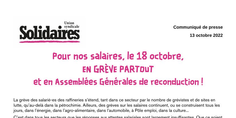 L’union syndicale Solidaires appelle à se mettre en grève sur l’ensemble du territoire dès le 18 octobre et à multiplier partout les assemblées générales en mettant en débat la reconduction.