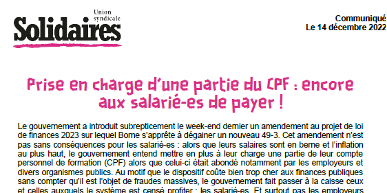 Le gouvernement a introduit subrepticement le week-end dernier un amendement au projet de loi de finances 2023 sur lequel Borne s’apprête à dégainer un nouveau 49-3. Cet amendement n’est pas sans conséquences pour les salarié-es : alors que leurs salaires sont en berne et l’inflation au plus haut, le gouvernement entend mettre en plus à leur charge une partie de leur compte personnel de formation (CPF) alors que celui-ci était abondé notamment par les employeurs et divers organismes publics. Au motif que le dispositif coûte bien trop cher aux finances publiques sans compter qu’il est l’objet de fraudes massives, le gouvernement fait passer à la caisse ceux et celles auxquels le système est censé profiter : les salarié-es. Et surtout pas les employeurs qu’on préfère aider massivement (soit le tiers du budget de l’Etat) sans qu’ils n’aient rien à devoir. Pour faire passer la pilule, les chômeurs-euses ne sont pas appelé-es à contribuer. Il faut dire que la réforme de l’assurance chômage est là pour de toute manière leur faire à nouveau les poches : ils et elles évitent une sorte de « double peine ».