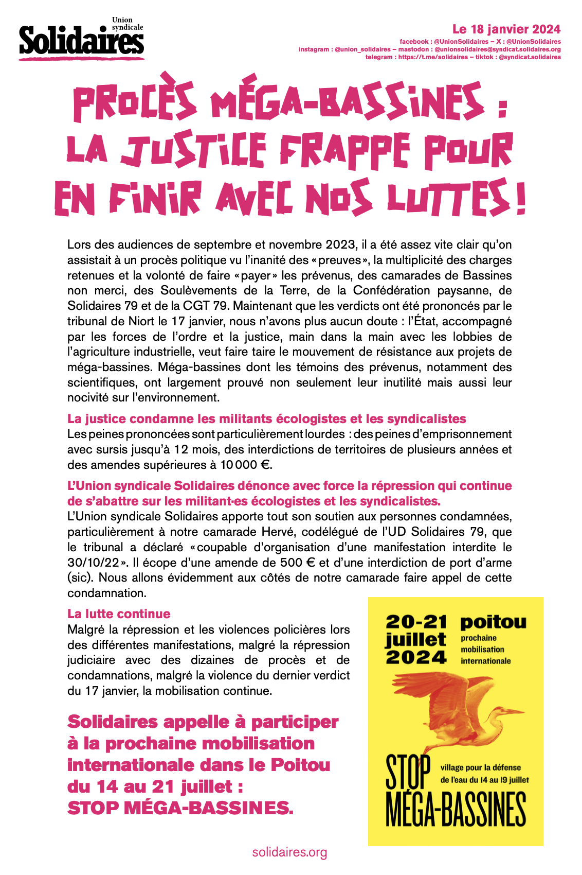 Lors des audiences de septembre et novembre 2023, il a été assez vite clair qu’on assistait à un procès politique vu l’inanité des « preuves », la multiplicité des charges retenues et la volonté de faire «payer» les prévenus, des camarades de Bassines non merci, des Soulèvements de la Terre, de la Confédération paysanne, de Solidaires 79 et de la CGT 79. Maintenant que les verdicts ont été prononcés par le tribunal de Niort le 17 janvier, nous n’avons plus aucun doute : l’État, accompagné par les forces de l’ordre et la justice, main dans la main avec les lobbies de l’agriculture industrielle, veut faire taire le mouvement de résistance aux projets de méga-bassines. Méga-bassines dont les témoins des prévenus, notamment des scientifiques, ont largement prouvé non seulement leur inutilité mais aussi leur nocivité sur l’environnement.