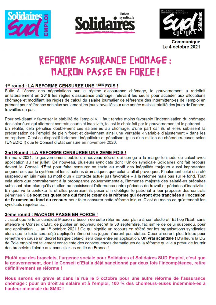 … sauf que le futur candidat Macron a besoin de cette réforme pour plaire à son électorat. Et hop l’Etat, sans attendre le Conseil d’Etat, de publier un nouveau décret le 30 septembre, fac similé de celui suspendu, pour une application …. au 1er octobre 2021 ! Ce qui signifie un recours en référé par les organisations syndicales alors que le texte sera déjà appliqué même si les juges n’auront pas statué. Ceux-ci seront plus frileux pour remettre en cause un décret lorsque celui-ci sera déjà entré en application. Un vrai scandale ! D’ailleurs la DG de Pole emploi est tellement consciente des conséquences dramatiques de la réforme qu’elle a prévu de fournir des bracelets d’alerte aux conseiller-es en Ile de France !