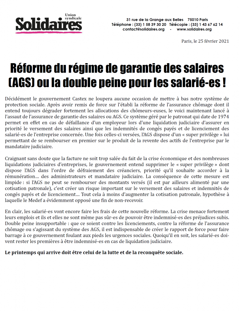 Décidément le gouvernement Castex ne loupera aucune occasion de mettre à bas notre système de protection sociale. Après avoir remis de force sur l’établi la réforme de l’assurance chômage dont il entend toujours dégrader fortement les allocations des chômeurs-euses, le voici maintenant lancé à l’assaut de l’assurance de garantie des salaires ou AGS. Ce système géré par le patronat qui date de 1974 permet en effet en cas de défaillance d’un employeur lors d’une liquidation judiciaire d’assurer en priorité le versement des salaires ainsi que les indemnités de congés payés et de licenciement des salarié-es de l’entreprise concernée. Une fois celles-ci versées, l’AGS dispose d’un « super privilège » lui permettant de se rembourser en premier sur le produit de la revente des actifs de l’entreprise par le mandataire judiciaire.