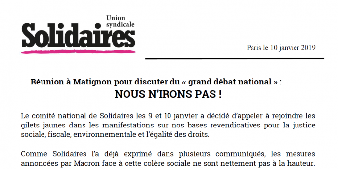Dans ce contexte, le comité national a décidé que Solidaires ne répondra pas favorablement à la demande de rencontre d’Edouard Philippe ce vendredi à propos du débat national.