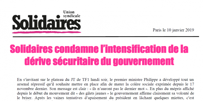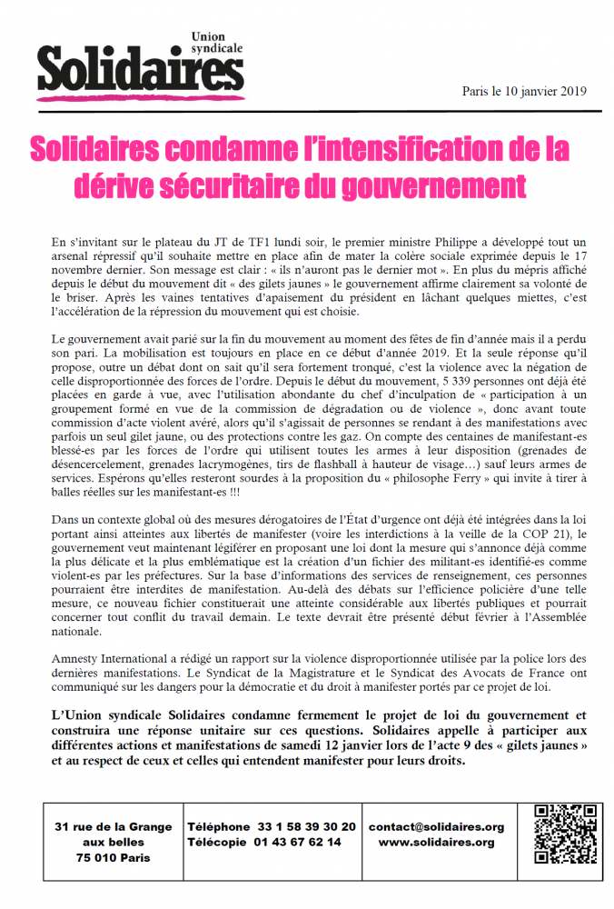 L’Union syndicale Solidaires condamne fermement le projet de loi du gouvernement et construira une réponse unitaire sur ces questions. Solidaires appelle à participer aux différentes actions et manifestations de samedi 12 janvier lors de l’acte 9 des « gilets jaunes » et au respect de ceux et celles qui entendent manifester pour leurs droits.