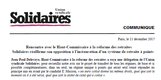 Solidaires réaffirme son opposition à l’instauration d’un système de retraite à points