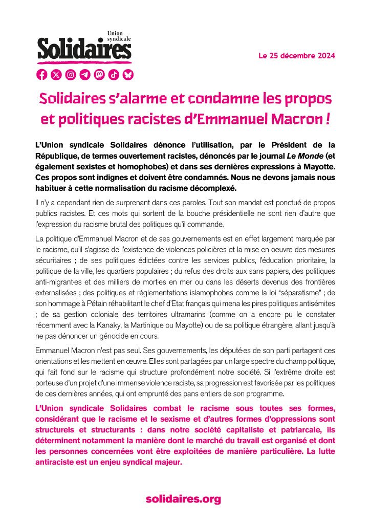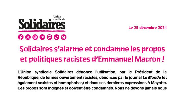L’Union syndicale Solidaires dénonce l’utilisation, par le Président de la République, de termes ouvertement racistes, dénoncés par le journal Le Monde (et également sexistes et homophobes) et dans ses dernières expressions à Mayotte. Ces propos sont indignes et doivent être condamnés. Nous ne devons jamais nous habituer à cette normalisation du racisme décomplexé.