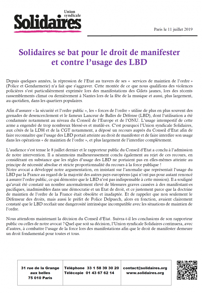 Afin d’assurer « la sécurité et l’ordre public », les « forces de l’ordre » utilise de plus en plus souvent des grenades de desencerclement et le fameux Lanceur de Balles de Défense (LBD), dont l’utilisation a été condamnée notamment au niveau du Conseil de l’Europe et de l’ONU. L’usage intempestif de cette arme a engendré de trop nombreux blessé-es et mutilé-es. C’est pourquoi l’Union syndicale Solidaires, aux côtés de la LDH et de la CGT notamment, a déposé un recours auprès du Conseil d’Etat afin de faire reconnaître que l’usage des LBD portait atteinte au droit de manifester et de faire interdire son usage dans les opérations « de maintien de l’ordre », et plus largement de l’interdire complètement.