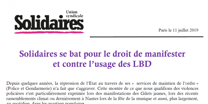 Afin d’assurer « la sécurité et l’ordre public », les « forces de l’ordre » utilise de plus en plus souvent des grenades de desencerclement et le fameux Lanceur de Balles de Défense (LBD), dont l’utilisation a été condamnée notamment au niveau du Conseil de l’Europe et de l’ONU. L’usage intempestif de cette arme a engendré de trop nombreux blessé-es et mutilé-es. C’est pourquoi l’Union syndicale Solidaires, aux côtés de la LDH et de la CGT notamment, a déposé un recours auprès du Conseil d’Etat afin de faire reconnaître que l’usage des LBD portait atteinte au droit de manifester et de faire interdire son usage dans les opérations « de maintien de l’ordre », et plus largement de l’interdire complètement.