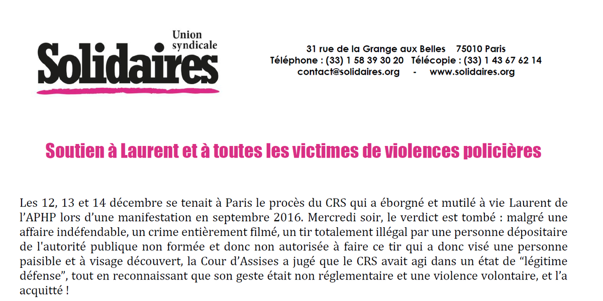 Les 12, 13 et 14 décembre se tenait à Paris le procès du CRS qui a éborgné et mutilé à vie Laurent de l’APHP lors d’une manifestation en septembre 2016. Mercredi soir, le verdict est tombé : malgré une affaire indéfendable, un crime entièrement filmé, un tir totalement illégal par une personne dépositaire de l'autorité publique non formée et donc non autorisée à faire ce tir qui a donc visé une personne paisible et à visage découvert, la Cour d’Assises a jugé que le CRS avait agi dans un état de “légitime défense”, tout en reconnaissant que son geste était non réglementaire et une violence volontaire, et l’a acquitté !