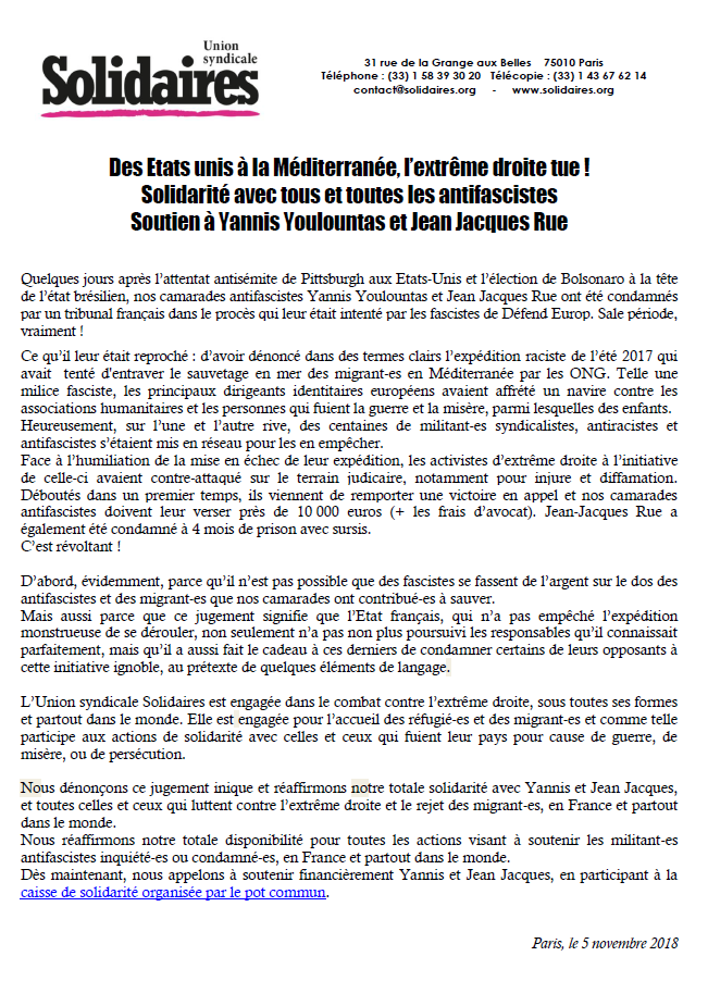 Ce qu’il leur était reproché : d’avoir dénoncé dans des termes clairs l’expédition raciste de l’été 2017 qui avait tenté d'entraver le sauvetage en mer des migrant-es en Méditerranée par les ONG. Telle une milice fasciste, les principaux dirigeants identitaires européens avaient affrété un navire contre les associations humanitaires et les personnes qui fuient la guerre et la misère, parmi lesquelles des enfants. Heureusement, sur l’une et l’autre rive, des centaines de militant-es syndicalistes, antiracistes et antifascistes s’étaient mis en réseau pour les en empêcher.