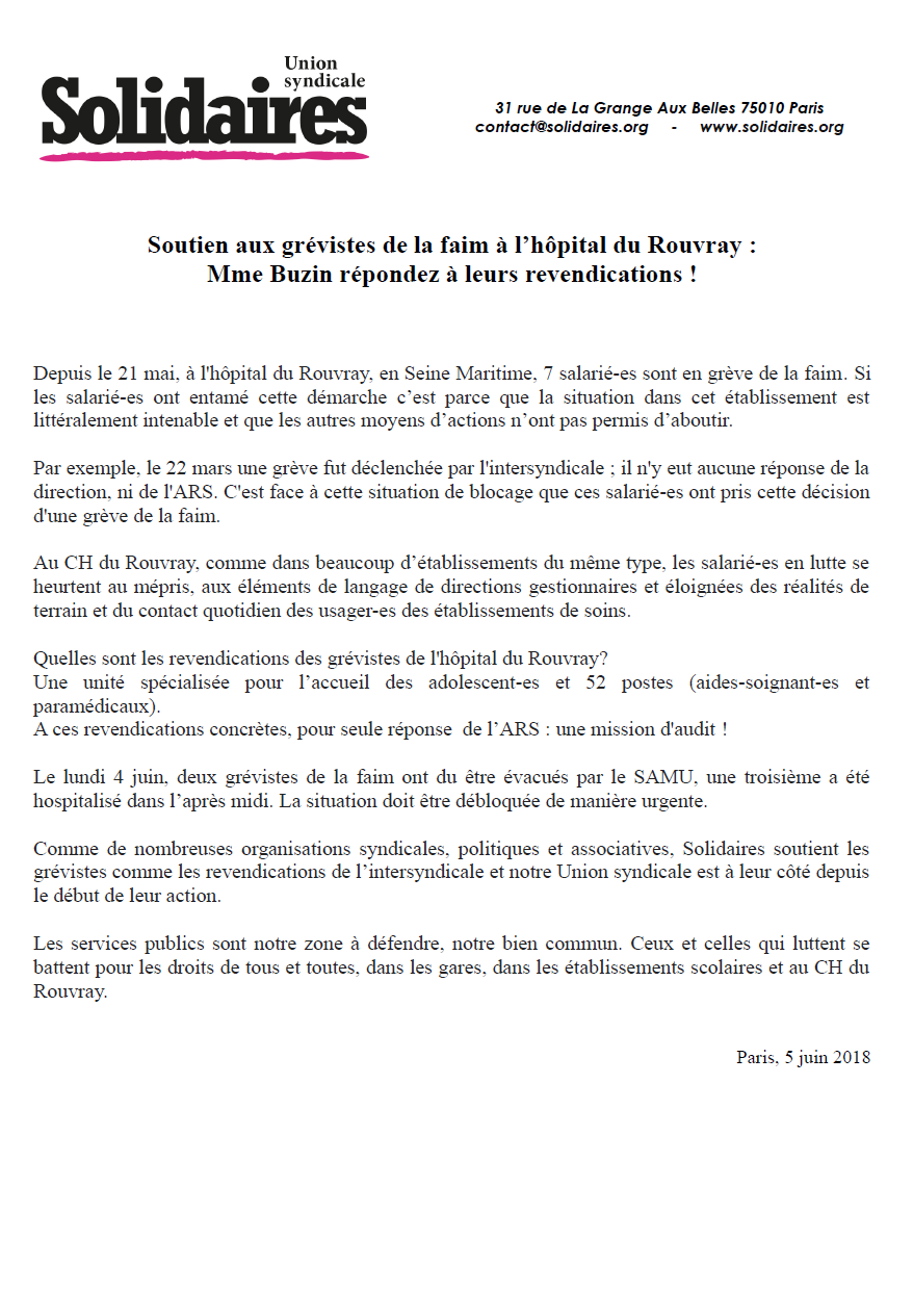 Depuis le 21 mai, à l'hôpital du Rouvray, en Seine Maritime, 7 salarié-es sont en grève de la faim. Si les salarié-es ont entamé cette démarche c’est parce que la situation dans cet établissement est littéralement intenable et que les autres moyens d’actions n’ont pas permis d’aboutir.