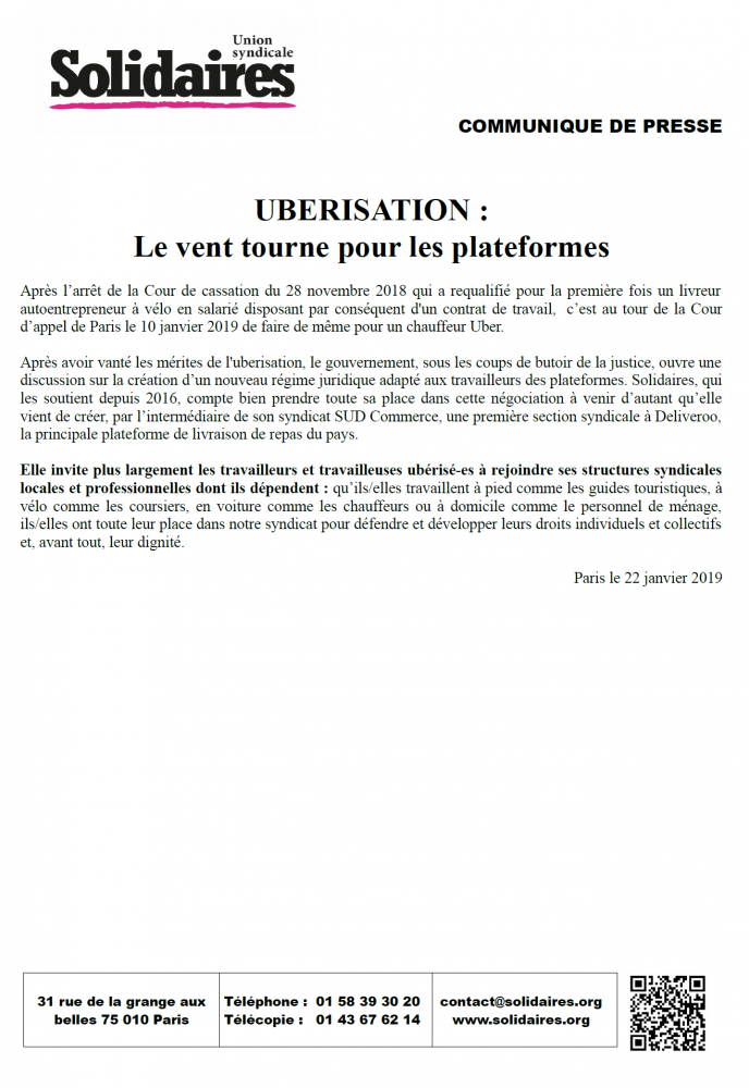 Elle invite plus largement les travailleurs et travailleuses ubérisé-es à rejoindre ses structures syndicales locales et professionnelles dont ils dépendent : qu’ils/elles travaillent à pied comme les guides touristiques, à vélo comme les coursiers, en voiture comme les chauffeurs ou à domicile comme le personnel de ménage, ils/elles ont toute leur place dans notre syndicat pour défendre et développer leurs droits individuels et collectifs et, avant tout, leur dignité.