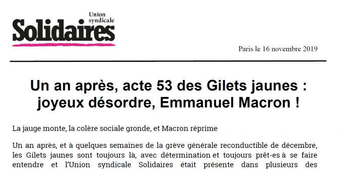Un an après, et à quelques semaines de la grève générale reconductible de décembre, les Gilets jaunes sont toujours là, avec détermination et toujours prêt-es à se faire entendre et l’Union syndicale Solidaires était présente dans plusieurs des manifestations. Dans de nombreuses villes, des cortèges, des ronds-points à nouveau occupés, avec ou sans blocage de la circulation et partout des slogans qui crient la colère sociale et dénoncent la misère et les attaques contre les conquis sociaux : les hospitaliers en grève étaient dans les cortèges avec les Gilets jaunes dans de nombreuses villes aujourd'hui. La réforme des retraites qui s'annonce était présente dans les slogans.