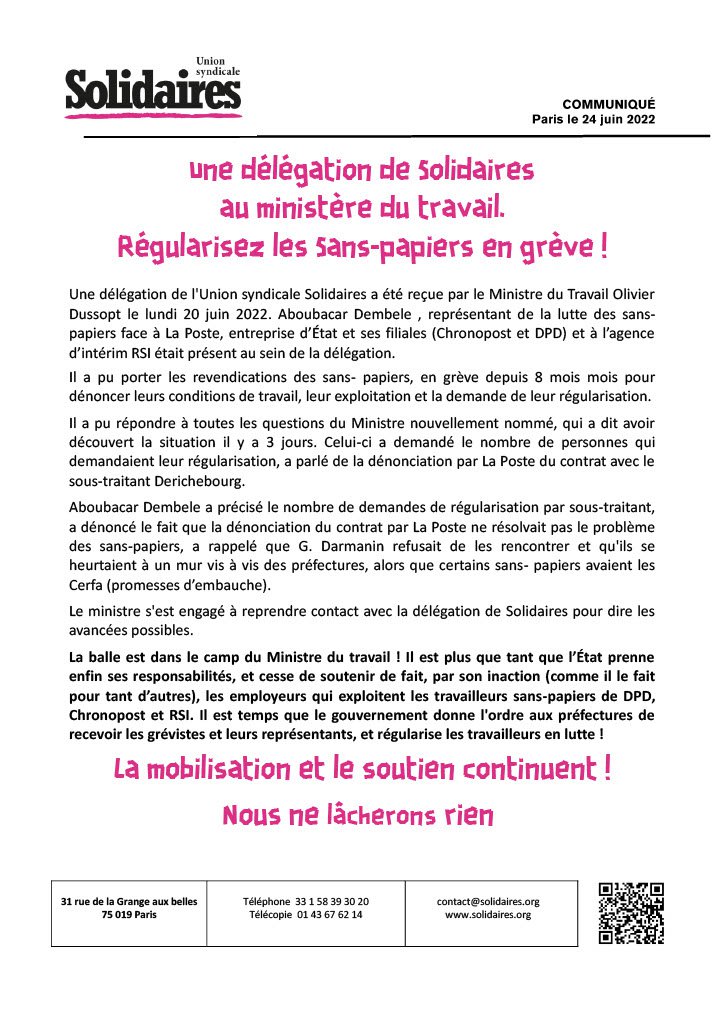 Une délégation de l'Union syndicale Solidaires a été reçue par le Ministre du Travail Olivier Dussopt le lundi 20 juin 2022. Aboubacar Dembele , représentant de la lutte des sans-papiers face à La Poste, entreprise d’État et ses filiales (Chronopost et DPD) et à l’agence d’intérim RSI était présent au sein de la délégation.