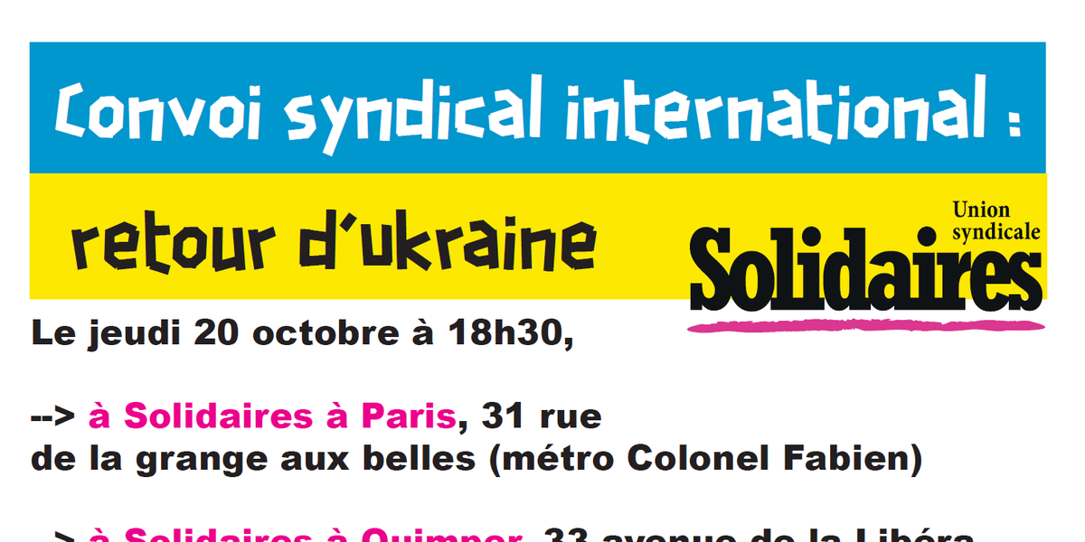 Une soirée est organisée le jeudi 27 octobre suite au retour du deuxième convoi du Réseau syndical international de solidarité et de luttes. Seront évoqués la situation sur place, les enjeux des convois, le matériel acheminé, les perspectives… Pour tous les syndicats, fédérations et les militant·es qui ont participé financièrement, ce sera l’occasion de connaitre plus précisément ce qui a été fait de leur engagement, d’échanger et de débattre.