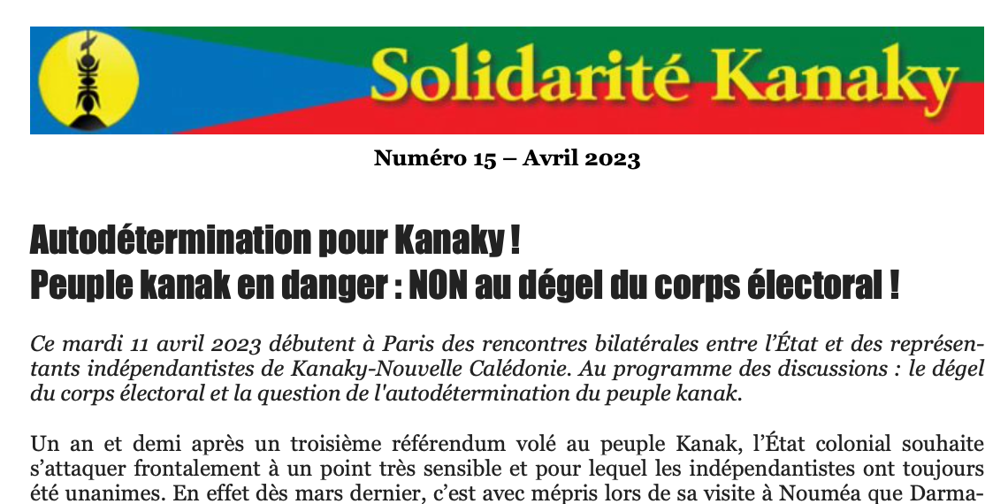 Le collectif solidarité Kanaky alerte par ce communiqué du danger et du risque historique pour le peuple kanak que serait un dégel du corps électoral, et se solidarise des courants indépendantistes kanak qui s’opposent à toute modification de celui-ci. Nous nous mobiliserons, et appelons à multiplier les actions en ce sens. Nous continuerons de dénoncer les conditions de déroulement du 3ème référendum, et resterons aux côtés du peuple kanak pour son autodétermination.