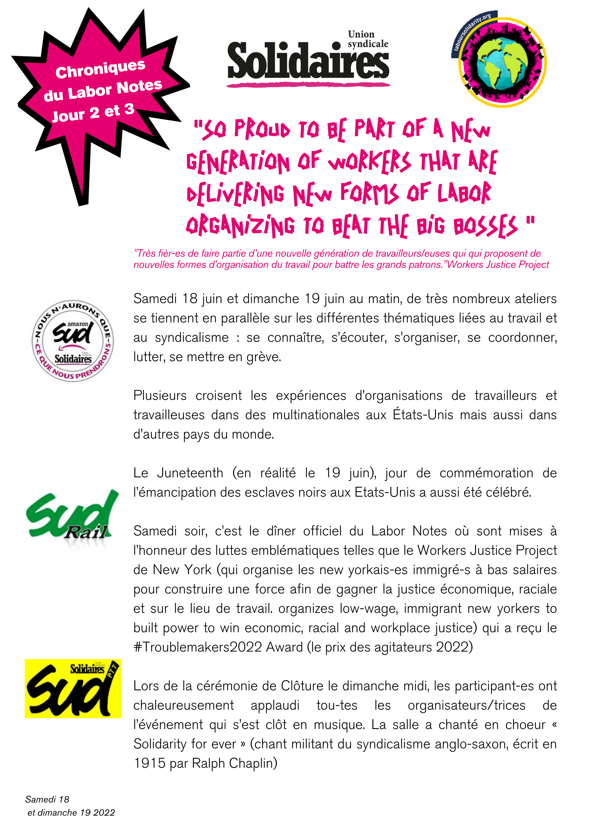 Samedi soir, c’est le dîner officiel du Labor Notes où sont mises à l’honneur des luttes emblématiques telles que le Workers Justice Project de New York (qui organise les new yorkais-es immigré-s à bas salaires pour construire une force afin de gagner la justice économique, raciale et sur le lieu de travail. organizes low-wage, immigrant new yorkers to built power to win economic, racial and workplace justice) qui a reçu le #Troublemakers2022 Award (le prix des agitateurs 2022)