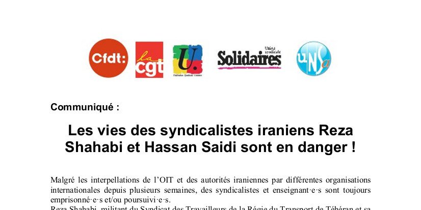 Reza Shahabi, militant du Syndicat des Travailleurs de la Régie du Transport de Téhéran et sa banlieue (Vahed) est en grève de la faim depuis le lundi 13 juin. Sa vie est aujourd'hui en danger. Hassan Saidi, un autre militant du syndicat Vahed a aussi entamé une grève de la faim depuis une semaine.