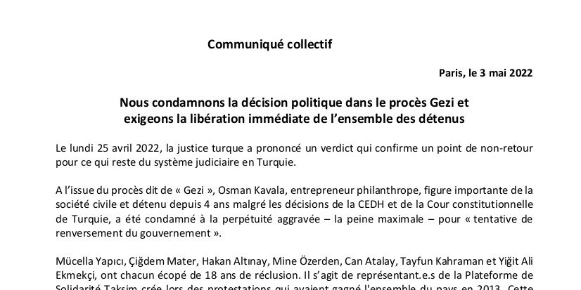A l’issue du procès dit de « Gezi », Osman Kavala, entrepreneur philanthrope, figure importante de la société civile et détenu depuis 4 ans malgré les décisions de la CEDH et de la Cour constitutionnelle de Turquie, a été condamné à la perpétuité aggravée – la peine maximale – pour « tentative de renversement du gouvernement ».