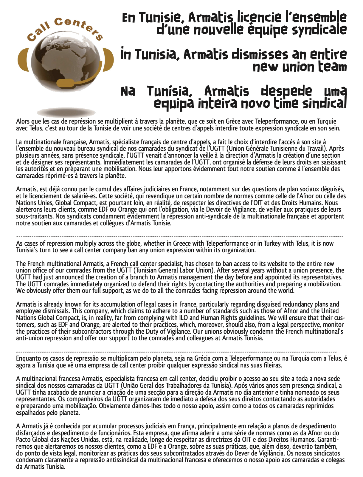 Armatis, est déjà connu par le cumul des affaires judiciaires en France, notamment sur des questions de plan sociaux déguisés, et le licenciement de salarié-es. Cette société, qui revendique un certain nombre de normes comme celle de l’Afnor ou celle des Nations Unies, Global Compact, est pourtant loin, en réalité, de respecter les directives de l’OIT et des Droits Humains. Nous alerterons leurs clients, comme EDF ou Orange qui ont l’obligation, via le Devoir de Vigilance, de veiller aux pratiques de leurs sous-traitants. Nos syndicats condamnent évidemment la répression anti-syndicale de la multinationale française et apportent notre soutien aux camarades et collègues d’Armatis Tunisie.