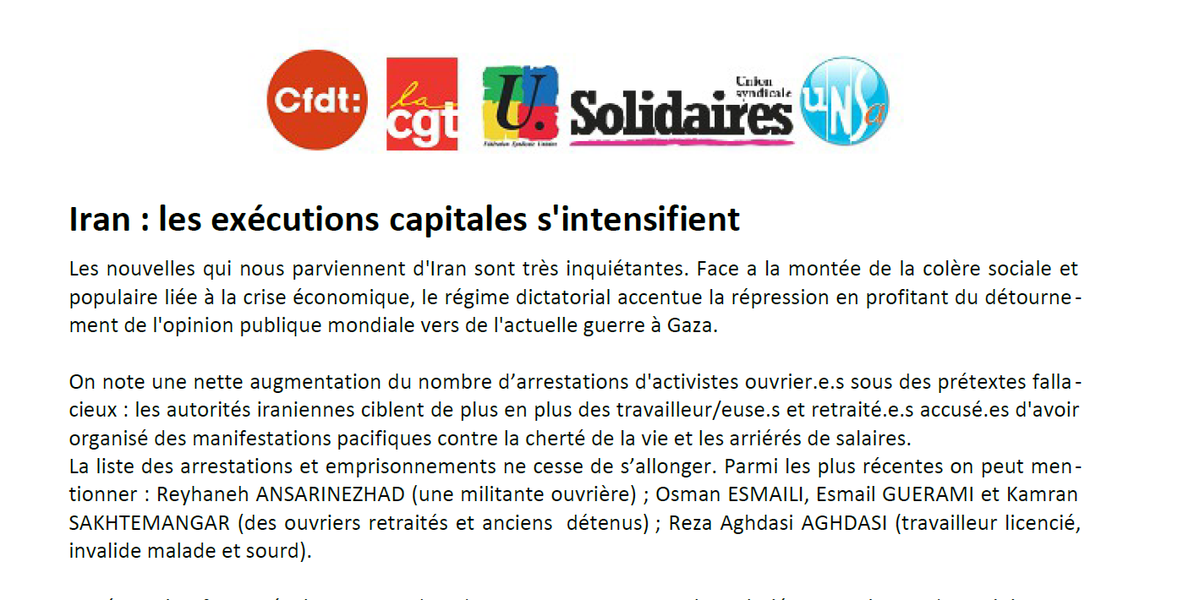 Les organisations syndicales françaises réaffirment leur solidarité avec les victimes de la répression. Elles condamnent avec force cette politique insupportable. Elles demandent : - L'abolition de la peine de mort, - L’annulation de toutes les condamnations injustes et contraires aux libertés et droits fondamentaux ; - La libération immédiate et sans condition de l’ensemble des militant·e·s emprisonné·e·s en raison de leurs opinions ou de leurs activités syndicales et associatives, ainsi que des citoyenn-es étranger.es dont Cécile KOHLER et Jacques PARIS ; nous demandons également l'arrêt des poursuites dont ils/elles font l'objet ; - Le respect par le régime iranien des Conventions internationales et notamment celles de l'Organisation internationale du travail (OIT), dont celles concernant la liberté d'association, de manifestation, de grève et de négociation collective.