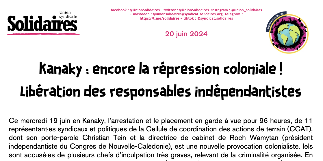- affirme sa solidarité avec le peuple kanak et avec toutes les victimes (et leurs proches) de la répression exercée, sur différents plans, par l’État français,