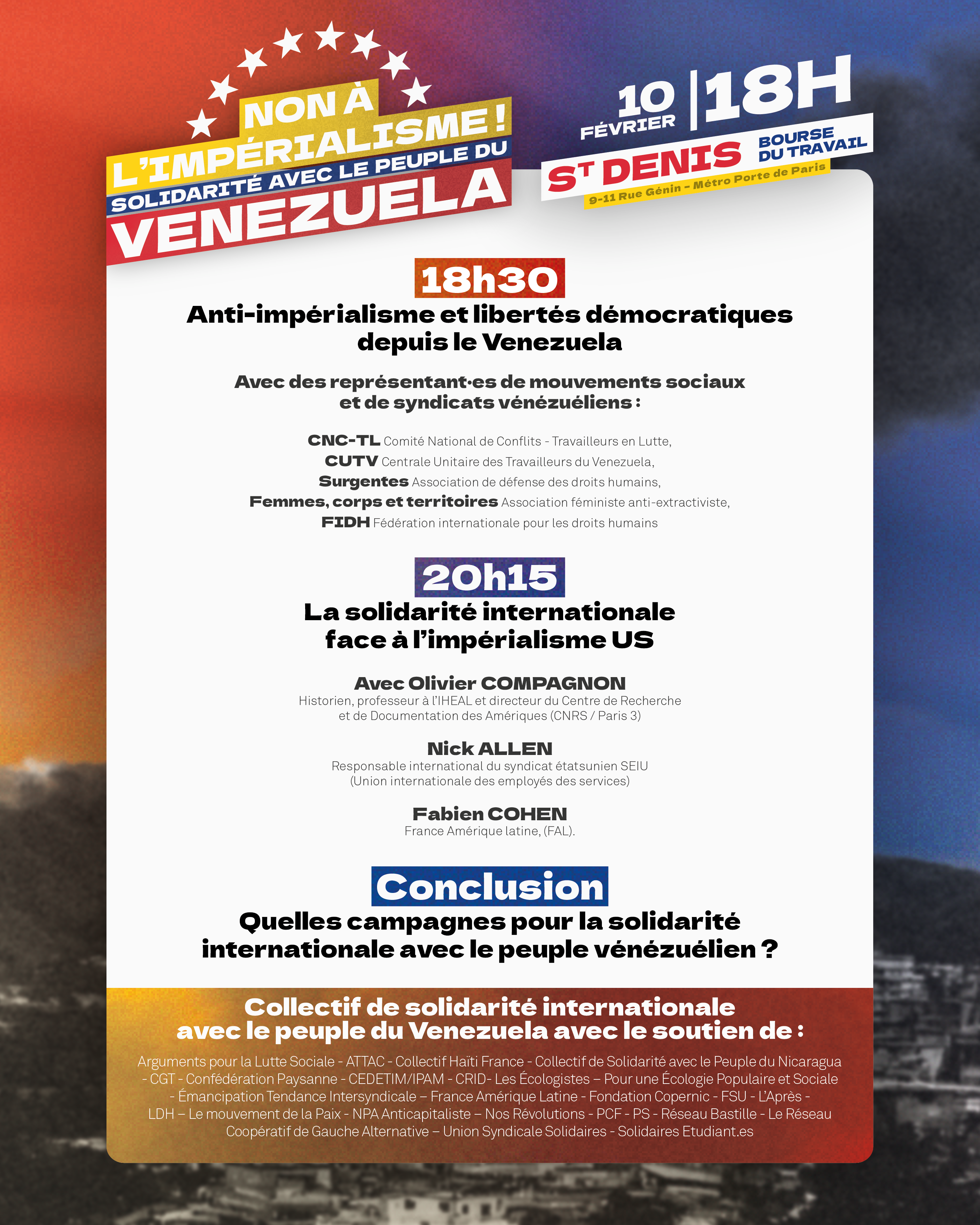 18h30 : « Anti-impérialisme et libertés démocratiques depuis le Venezuela », avec des représentant·es de mouvements sociaux et de syndicats vénézuéliens