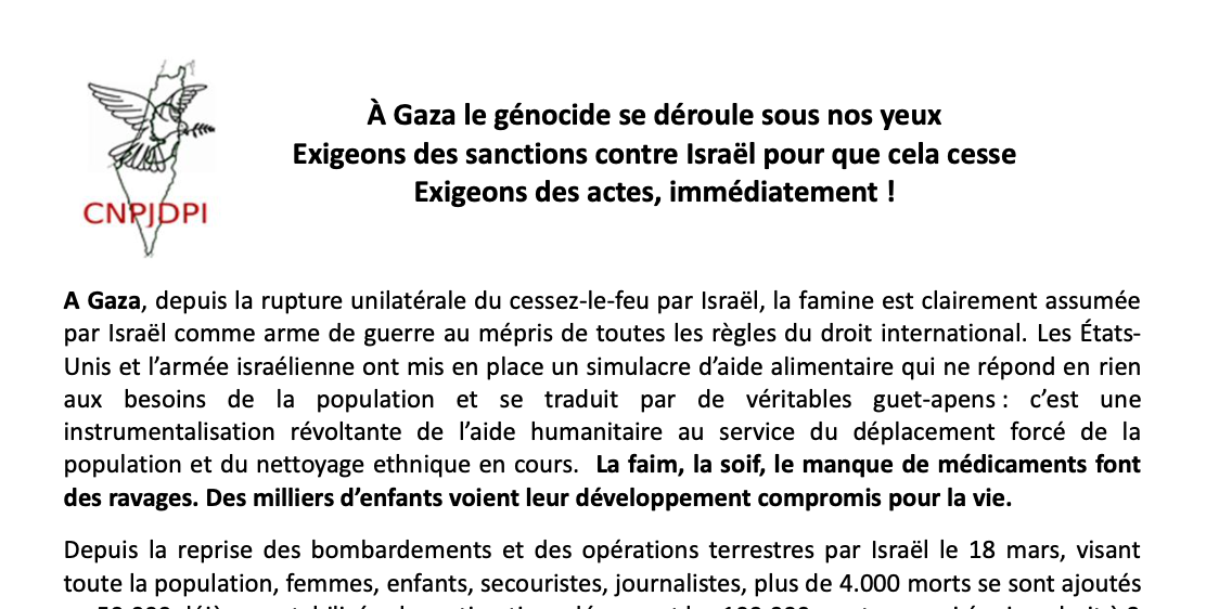 Le Collectif National pour une Paix Juste et Durable entre Palestiniens et Israéliens (CNPJDPI) dénonce la guerre génocidaire menée par l’État israélien contre le peuple palestinien. Ce sont des décennies d'une impunité totale de l’État d’Israël, alors qu’il viole en permanence le droit international, qui nous ont menés à cette situation. Une situation qui concerne plus largement la région, avec les violations répétées par Israël du cessez-le-feu avec le Liban, et les attaques israéliennes contre la Syrie ainsi que l’occupation d’une partie de son territoire. Nous demandons qu'il soit mis fin à cette impunité et que des sanctions soient prises tant que l’État d’Israël ne se conforme pas au droit international.