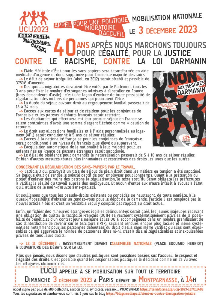 L'UCIJ appelle à se mobiliser partout en France contre le projet de loi Darmanin le dimanche 3 décembre avec la Marche pour l'Égalité (à Paris le rendez vous pour le départ de la manifestation aura lieu à Montparnasse à partir de 14h00).