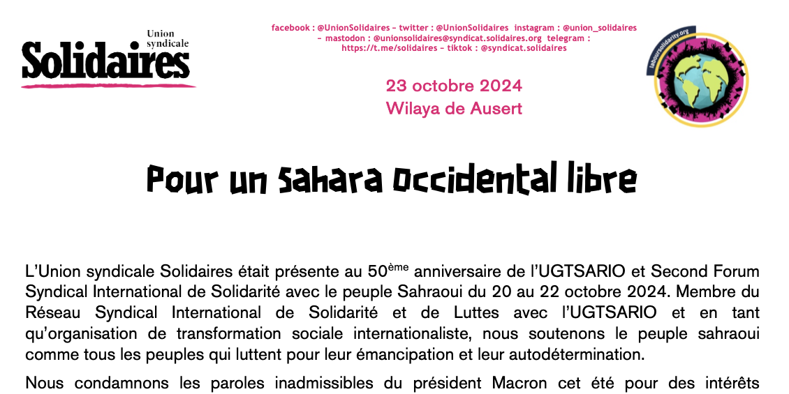 L’Union syndicale Solidaires était présente au 50ème anniversaire de l’UGTSARIO et Second Forum Syndical International de Solidarité avec le peuple Sahraoui du 20 au 22 octobre 2024. Membre du Réseau Syndical International de Solidarité et de Luttes avec l’UGTSARIO et en tant qu’organisation de transformation sociale internationaliste, nous soutenons le peuple sahraoui comme tous les peuples qui luttent pour leur émancipation et leur autodétermination.
